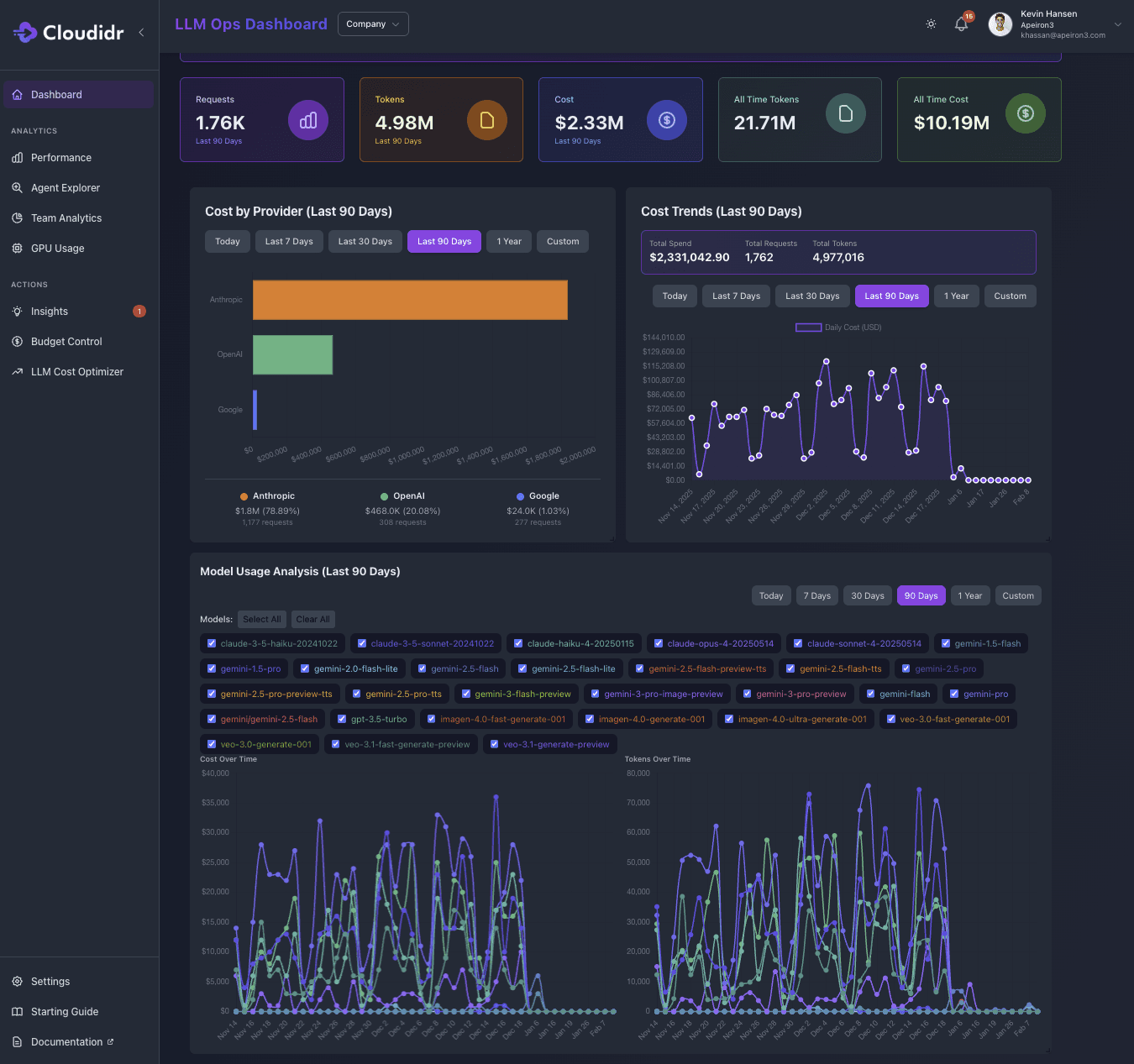 AI detects expensive models, finds cheaper alternatives, flags cost anomalies. Actionable recommendations with estimated monthly savings.