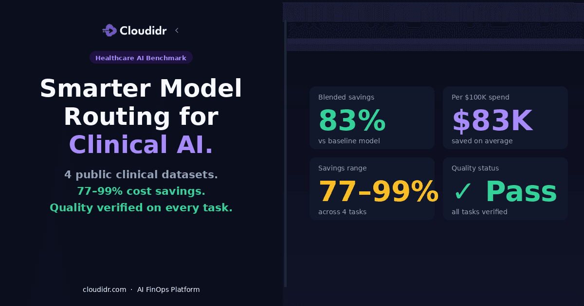 Cloudidr's intelligent model routing addresses both. This post benchmarks routing across four public clinical datasets — two summarization tasks and two emergency triage tasks — and reports cost savings alongside clinically grounded quality evaluation. The goal is a transparent, reproducible story: open datasets, documented methodology, and a quality gate that ensures savings are not "cheap at the price of safety."