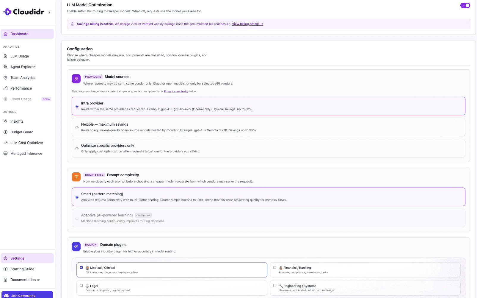 Step 3 — Enable the Medical / Clinical Domain Plugin Under Domain Plugins, check Medical / Clinical. This enables domain-aware complexity scoring for clinical notes, diagnoses, and treatment plans. For healthcare workloads this step will big gains — without it, the routing engine treats clinical content as general-purpose text and may under-route complex notes or over-route sensitive triage prompts. With it enabled, the engine applies clinical vocabulary and structure signals when deciding which model tier a prompt warrants.