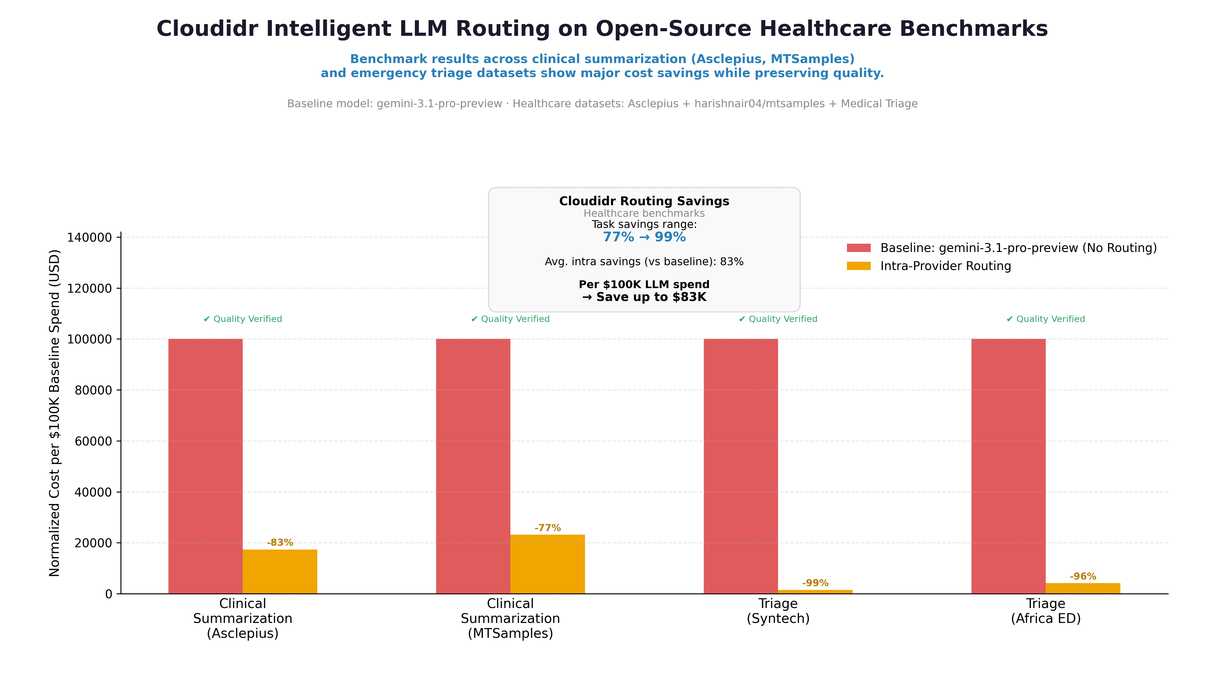 We benchmarked Cloudidr's intelligent model routing on four public clinical datasets: two summarization tasks (Asclepius synthetic clinical notes and MTSamples transcriptions) and two emergency triage tasks (Syntech and Africa ED). The baseline was gemini-3.1-pro-preview with no routing. The routed phase used intra-provider routing — staying within the same provider family.